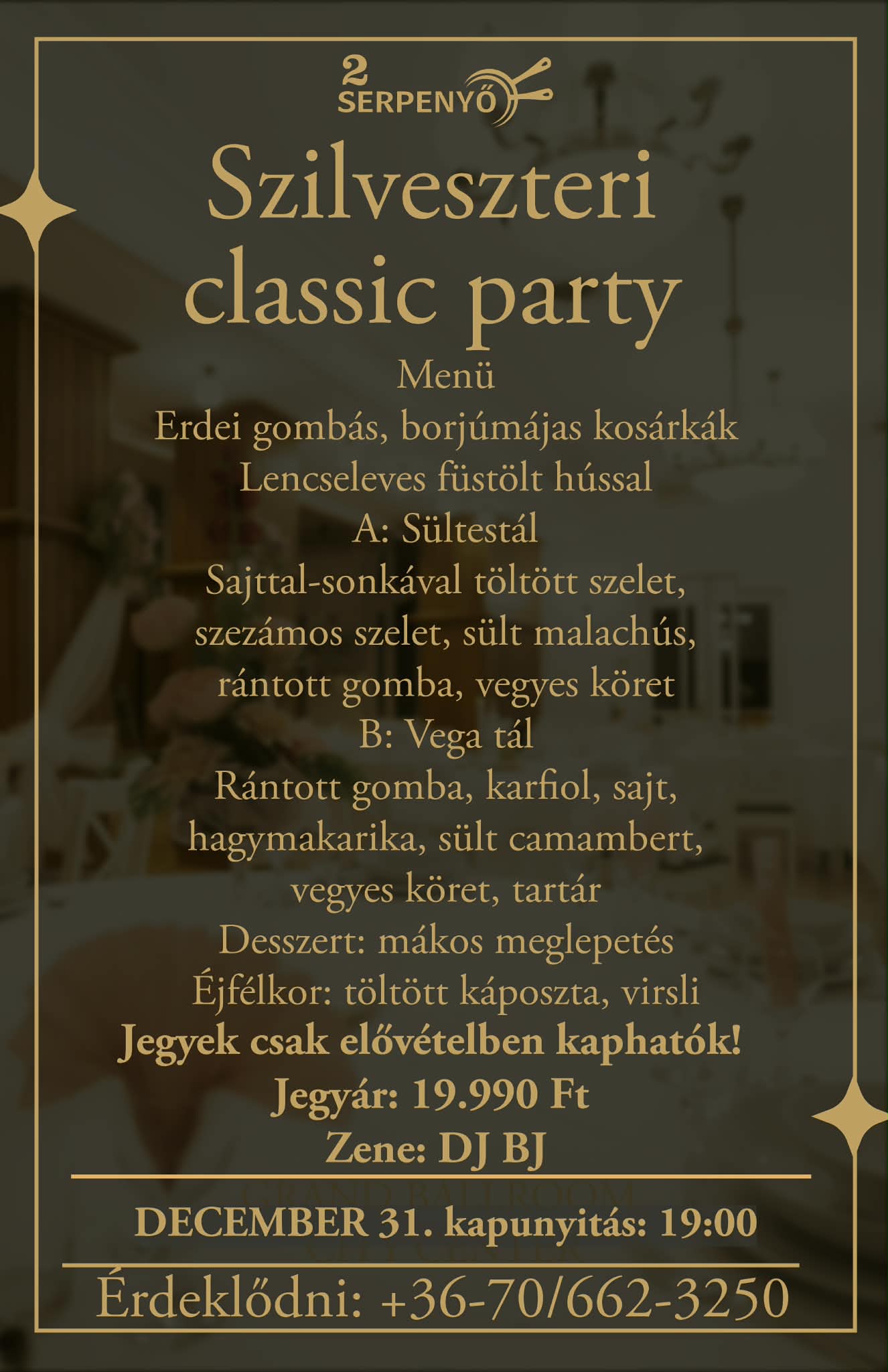 Kiskunfélegyháza Könyök utca 2 Zöldségleves A: Hentes tokány tésztával B: Sobri szelet rizzsel 29-30-31-re Szilveszteri Előrendelést Felveszünk ! SZILVESZTERI CLASSIC PARTY dec. 31. további infókért KATT IDE! Minden nap: Rántott szelet vagy rántott sajt körettel választható! Délutáni ajánlatunkat ITT találja Hétfőtől Szombatig 14 - 20:30-ig rendelhető! Honlapunkon www.2serpenyo.hu délutáni ajánlatainkat rendelheti meg. Minden nap gyümölcsleves Házhozszállításos menürendelés 10:00-ig